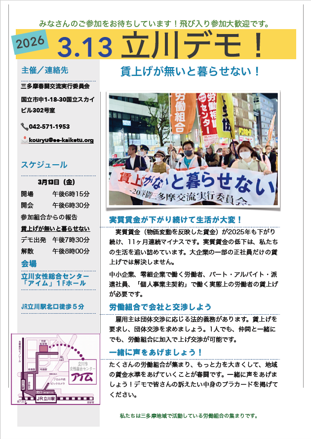 - 3月13日(金) 18時から 春闘三多摩交流実行委員会立川デモ